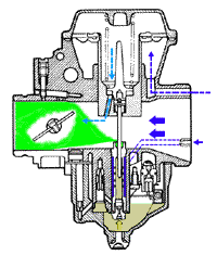 Unterdruck in die oben liegende Membrankammer geleitet und saugt den