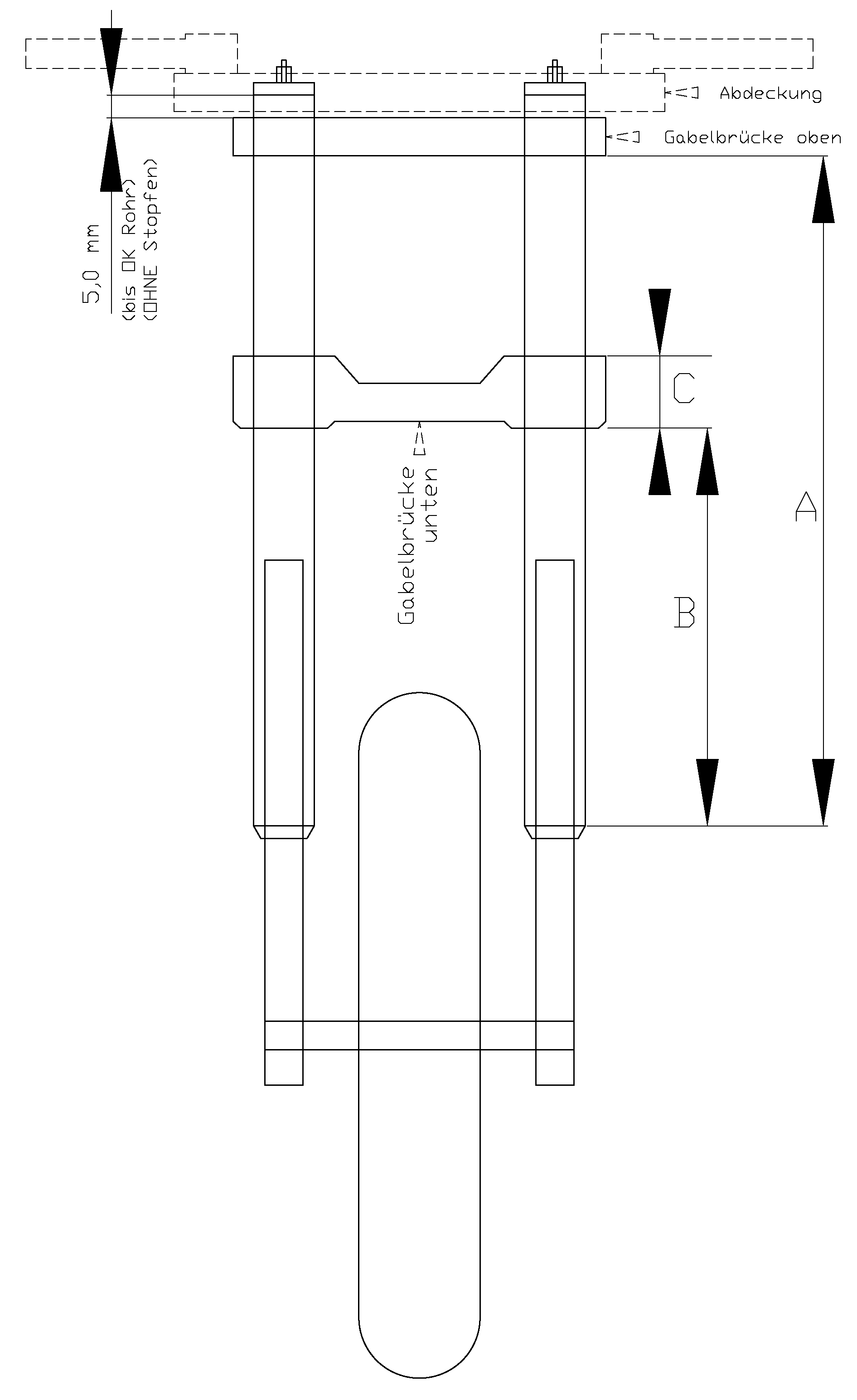Deshalb hier (unmaßstäblich) eine Skizze mit den vier wichtigsten Maßen einer originalen Gabel. Ach ja - alle Maße +/- 0,5 - 1,0 mm Meßungenauigkeit.
