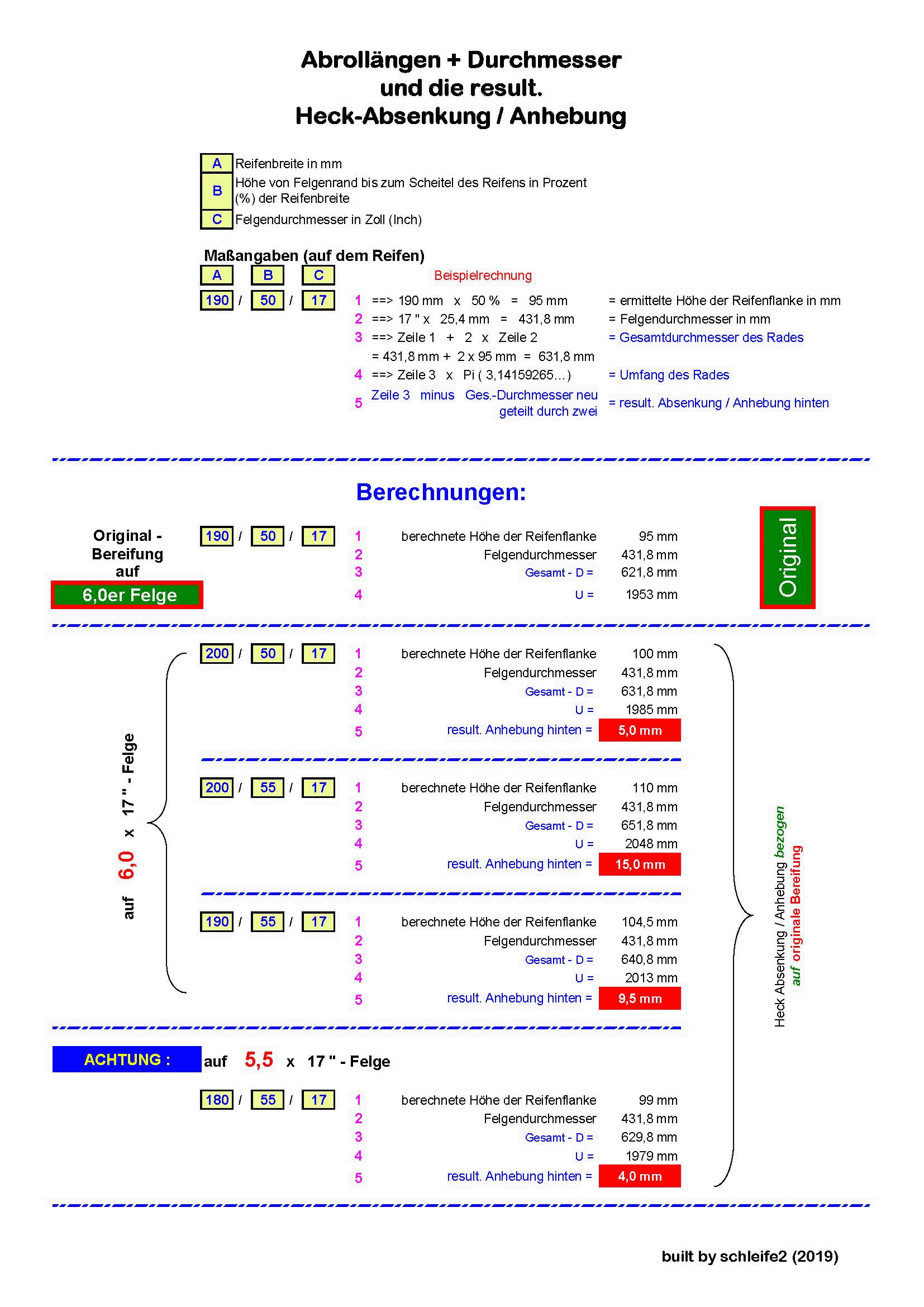 WWICHTIG :x Die Reifen - Größen 190 / 55, 200 / 50 und 200 / 55 habe ich noch nie verbaut und somit keinerlei Erfahrung damit. · Was diese Größen an Änderungen der Fahrwerksgeometrie rein rechnerisch bewirken , kann jeder leicht an Hand des unten eingestellten Bildes bzw. der da hinterlegten pdf erkennen. · Was diese anderen Reifen - Größen im Betrieb bewirken ? Auch dazu kann ich nichts sagen, weil ich keinerlei Erfahrung damit habe.