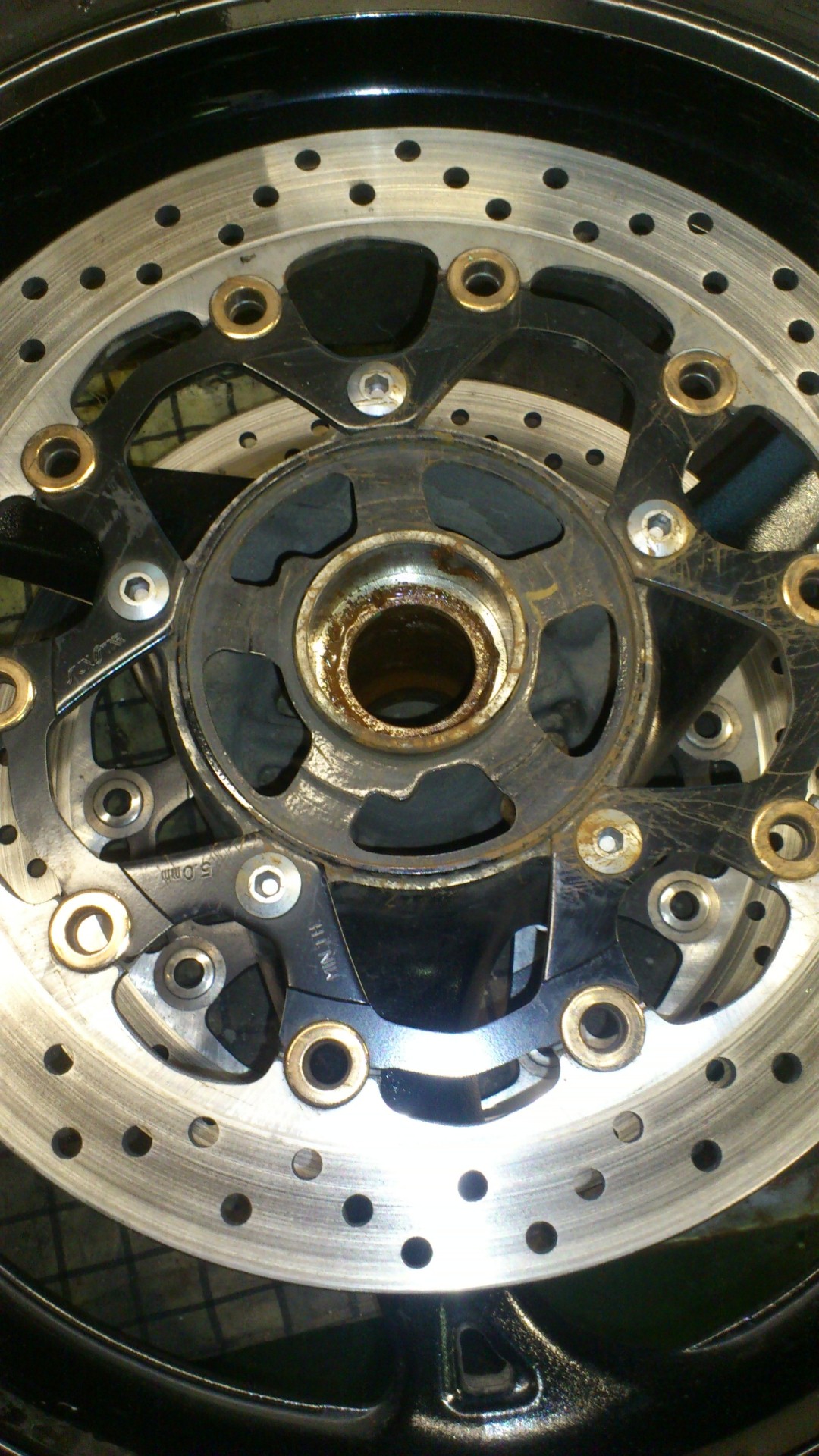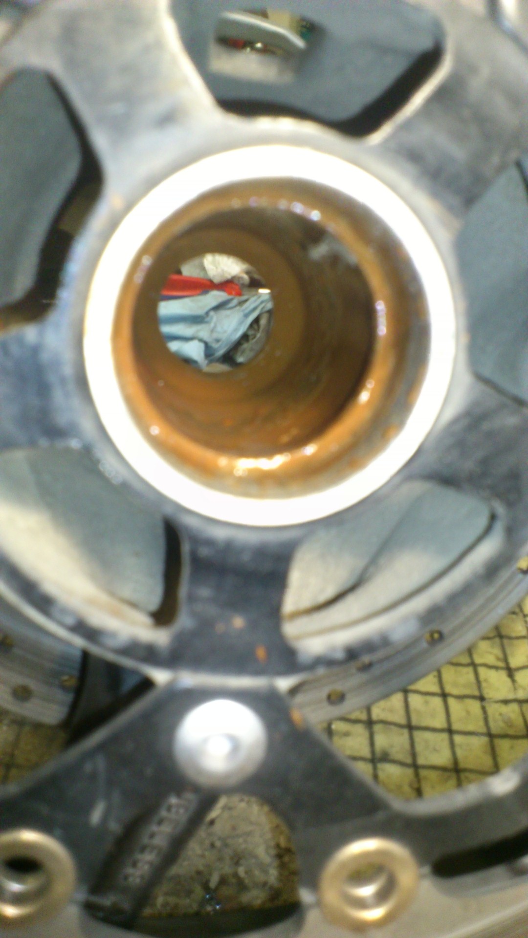 Man beachte die "Fahnen" der rostigen Brühe auf der rechten Bremsscheibe, und die Ablagerung der Rostbrühe in der Felge.