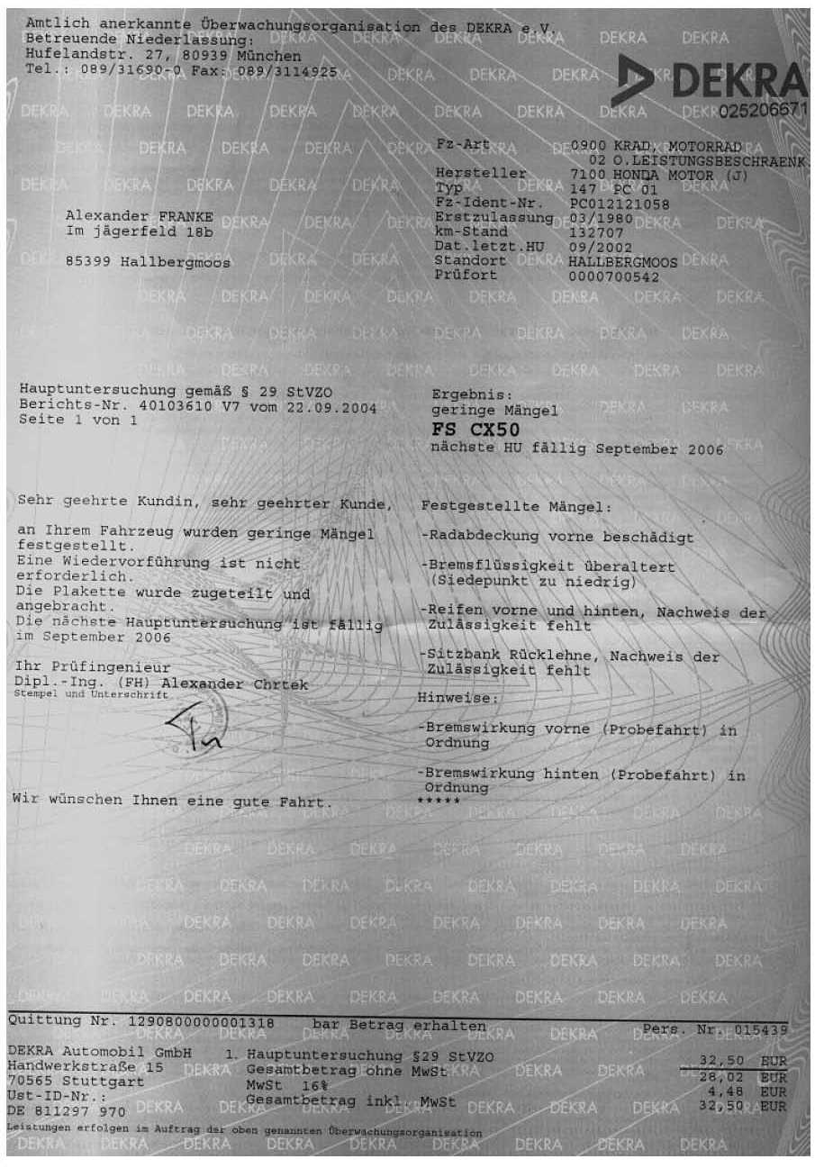 Die HU ist fällig, oder  Diese Geschichte ist in keiner Weise übertrieben, gestellt oder erfunden. Sie ist mir am Mittwoch den 22.09.04 so bei der DEKRA Prüfstelle München in der Hufelandstraße passiert. Um es gleich vorne weg zu sagen: Ich habe die Plakette erhalten, wenn gleich sich das mit dem Prüfbericht widerspricht. Wie es zu diesem Bericht kam, möchte ich nun schildern, mit aller wörtlichen Rede, wie sie mir gegenüber geäußert wurde. Es begab sich also, daß ich mal wieder mit´m Mopped zur HU musste. Die Tatsache, daß ich eine DEKRA in der Nähe meiner Arbeitsstätte habe, bringt es mit sich, daß ich seit Jahren hierher fahre. Sei es für die HU oder auch „nur“ für diverse Abnahmen meiner getätigten Umbauten. Einer der Herren sagte mir mal, daß sich der TÜV + DEKRA intern so geeinigt haben: „Wir von der DEKRA machen Eintragungen direkt in den Schein in den neuen Bundesländern und der TÜV in den Alten. Anders herum werden nur Abnahmebescheinigungen ausgestellt, die mitzuführen, aber genauso gültig sind.“ In wie weit das nun stimmt, kann ich nicht sagen… ist mir auch so was von egal. Warum ich das sage: ganz einfach, ich habe derzeit 4 Zettel für meine Umbauten (Stahlflex, Vorgelegte, Konis, großer Tank) von der DEKRA in meinem Koffer + ein Fax von Bridgestone (Technische Bescheinigung zur Vorlage beim Technischen Überwachungsverein) damit ich vorne den BT 45 in der metrischen Größe fahren kann. Die meisten Eintragungen im Schein hat mein Vorgänger machen lassen, von mir kam nur die Vorgelegte, die dann leider von der Seeger in eine Burchard geändert wurde (Rostproblem nach einem ¾ Jahr)….. daher der Zusatzzettel im Koffer. Es gibt noch eine kleine Vorgeschichte, die ich hier erwähnen muß. Ohne die fehlt die rechte Würze dieses Berichts und es würde die „Brisanz“ nicht recht rüber kommen. Ich bin Ende Juli wegen des großen Tanks und dem veränderten Vorderreifen zur Prüfstelle gefahren und der Hr. Schellack (Dipl. Ing.) hat alles für gut befunden. Zum Reifen meinte er ganz lapidar: „Sie haben ja die Freigabe vom Hersteller, das reicht uns und sie brauchen den Zettel nur bei der nächsten HU vorzeigen.“ Das freute mich natürlich, denn so hatte ich mir wieder Kohle gespart.