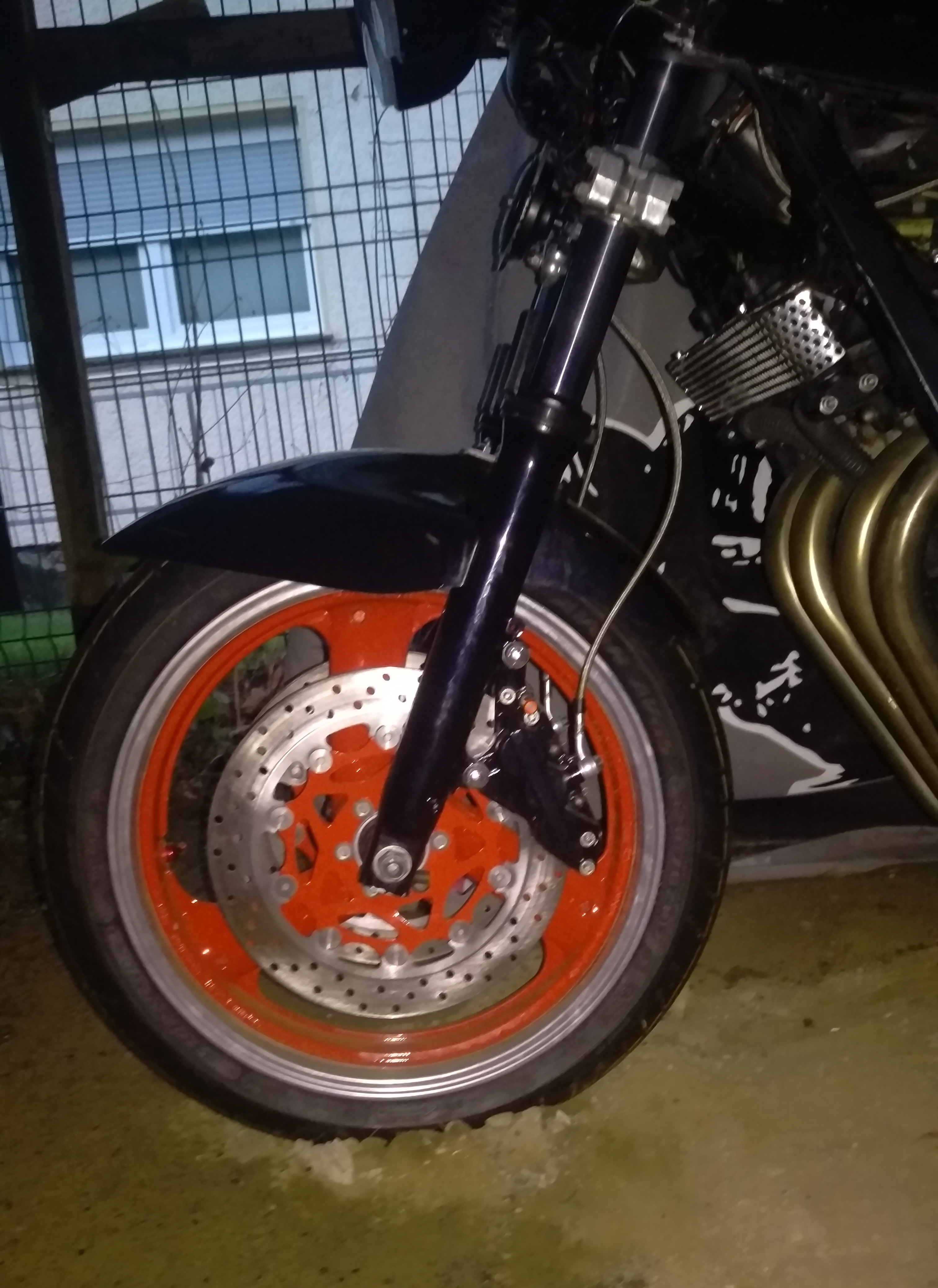 Tja, manch einer leidet so sehr unter den Rissen im originalen FJ-Kotflügel, dass er es leid ist und auf den Kotflügel der Bandit 1200 S umsteigen will. Soweit kein großes Problem, passt er doch von der Form her schick an die FJ. Ein "kleines" Problem gibt`s dann aber doch - nämlich wie das Ding an der Gabel (aller Modelle von ´84 - ´93) sauber und ordentlich zu befestigen. Denn der alte sog. Gabelstabi passt nicht mehr - null Chance das Ding weiter zu verwenden. Doch wer einen guten Fräser zur Hand hat, oder der exakten Metallbearbeitung fähig ist,