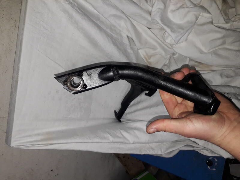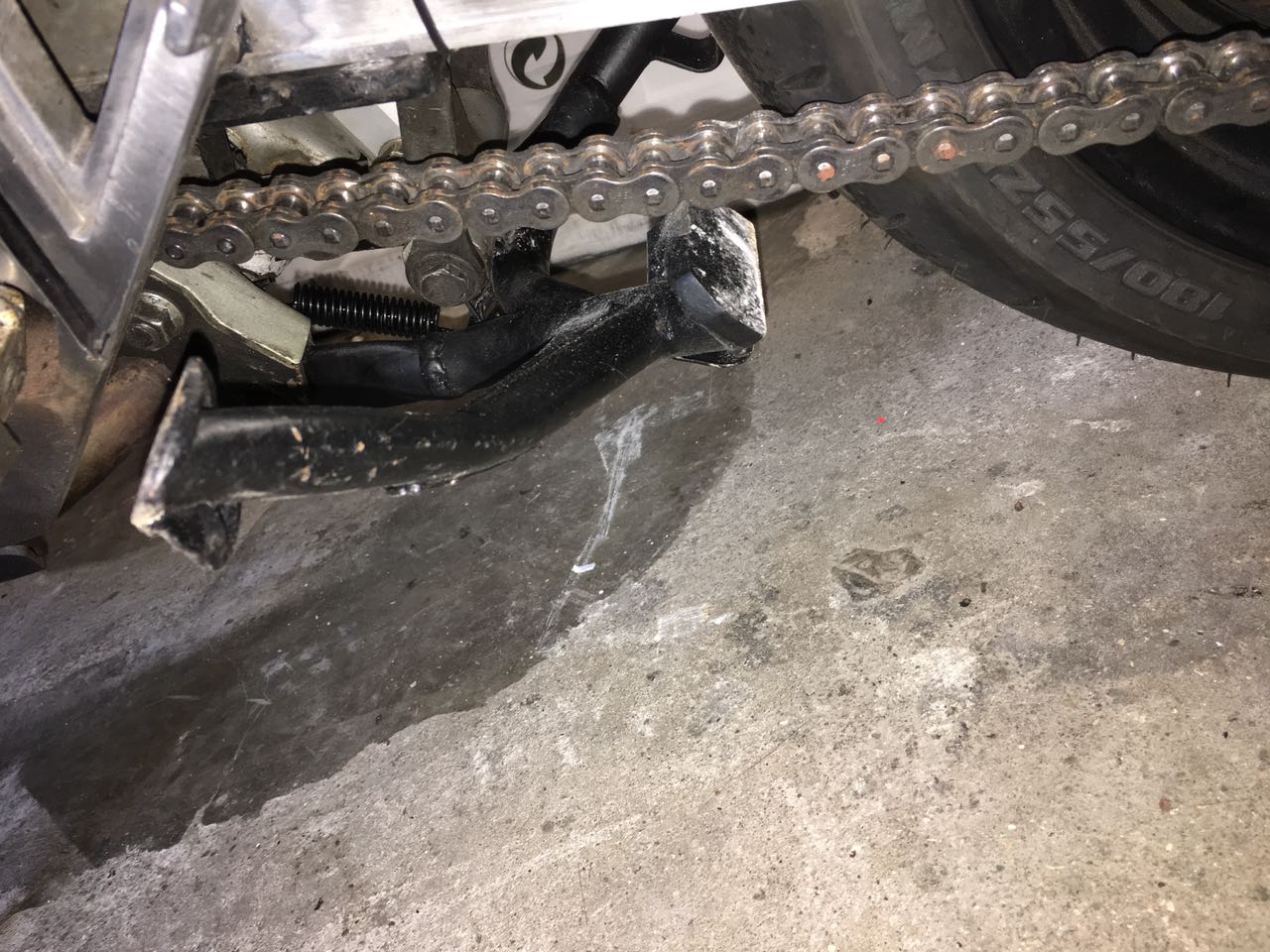 Der Rest des Umbaus gestaltet sich genauso wie bei den anderen FJ 1200 , also mit R62 Felge und einem Umbausatz bestehend aus geändertem Kettenradträger , geändertem Bremssattelhalter und neuer Bremsankerstrebe . Alles in Allem kostete mich, Käpt´n, der Hinterradumbau mit Schwingenumbau , neuem Federbein und neuem Hinterreifen so um die 800 € . Bei der Auswahl des Hinterreifens sollte man vorher mal die reale Breite ermitteln , ich habe den Avon Storm 3D in 180er Breite aufziehen lassen , wobei die reale Breite 187 mm beträgt und damit das Ende der Fahnenstange erreicht sein dürfte , bevor der Reifen an der Kette schleift . Der ganze Umbau funktioniert an der 1 XJ genauso wie hier beschrieben und von „Dennis FJ 1200 " erfolgreich und mit TÜV Segen durchgeführt. Jetzt bleibt noch das Problem mit dem Hauptständer , denn der Fuß - Ausleger könnte , wenn der Hauptständer original bliebe , in der nächsten schnelleren Linkskurve aufsetzen ! Also wird hinter dem Mittelsteg des Hauptständers auf beiden Seiten ein Keil ausgeflext , der Hauptständer soweit eingeknickt bis sich der Ausleger des Ständers ungefähr auf Höhe der Fußraste befindet . Danach den Hauptständer wieder verschweißen und unter die Auflagen ca.10mm unterlegen und anheften. Möglicherweise muß der Hauptständer noch ein wenig angepaßt werden, damit die Dicke auch wirklich fest auf dem Bock steht und nicht zu leicht abgebockt werden kann . Der Hauptständer wurde nur für Dennis wie oben beschrieben angepasst , ich fahre ohne Hauptständer und benutze für normale Wartungsarbeiten einen Montageständer . Bei Arbeiten die eine Demontage der Schwinge erfordern , baue ich den Hauptständer wieder unter die Dicke , sind ja nur zwei Bolzen.