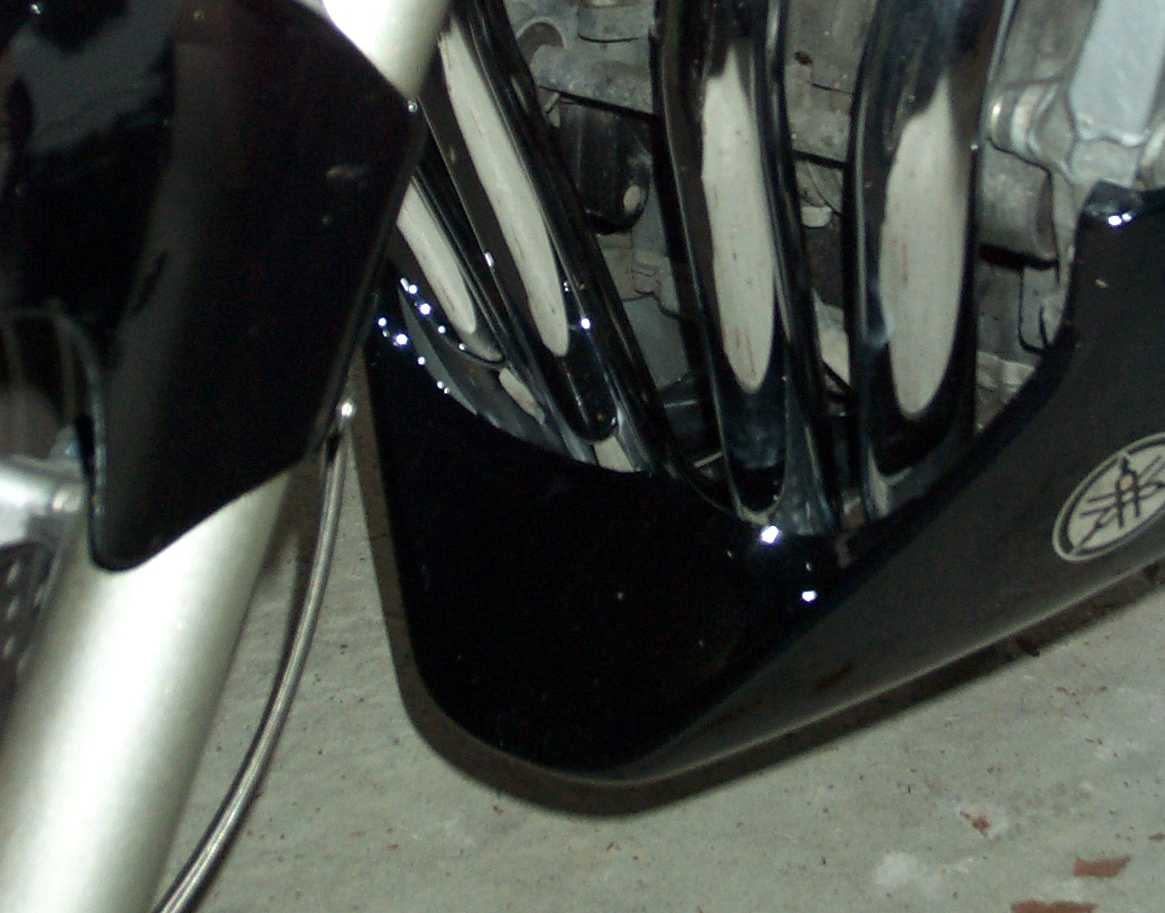 Nun war mir mein vergammelter Sammler ein Dorn im Auge. Und meine polierten Krümmer hätten so langsam auch mal wieder poliert werden können. Ich steh einfach auf Glanz!!! Ich kam auf das schmale Brett, daß die Krümmer der XJR 1200 passen müssten. Also bei eBAY aufgepaßt und nach einigen Tagen hatte ich einen nagelneuen Satz für eine kleine Mark, sorry Euro. Ich demontierte den ersten Krümmer, um dann festzustellen, dass ich die XJR-Krümmer nicht anbauen konnte. Es sind wirklich nur Millimeter, aber es passte einfach nicht. Der Radius ist etwas größer und die Krümmer ca. 1 cm länger als die der FJ. Also bot ich die Krümmer im Forum der Effjot - IG wieder zum Verkauf an. Dort bekam ich dann aber den Tip, ich solle die Dinger behalten, mir einen XJR-Sammler besorgen und dann mit etwas Mut, Spucke und einem Gummihammer die Krümmer nebst Sammler anbauen. Wir suchten also einen Sammler und ich bin halt Sven Glückspilz. Ein nagelneuer Sammler für 50 Euro :o) Nun ist bei der Montage folgendes zu beachten, wenn Ihr es mir gleich tun wollt: Schiebt erst die Krümmer mit der Hand bis zu Anschlag in den Sammler. Ich brauchte keinen Gummihammer. Legt das Teil auf einen Karton, der von der Höhe den Sammler fast unter den Motor bringen sollte. Nun führt Ihr die Krümmer auf die Auslässe. Falle! Die XJR hat nur dünne Scheiben zur Befestigung der Krümmer am Motorblock. Entweder Ihr dreht die Schrauben aus dem unteren Teil der Krümmer, um die Originalüberwürfe der FJ anstelle der XJR-Scheiben zu verwenden (empfohlen), oder Ihr legt Euch ca. 32 Unterlegscheiben oder 8 vorgefertigte Distanzhülsen (ca. 8 - 10 mm) zur Seite. Das Gewinde des Stehbolzens geht nicht weit genug Richtung Motorblock, um unmittelbar nur mit den Muttern die Geschichte fest zu bekommen. Zieht die Schrauben nur eben so an, dass die Krümmer noch lose am Auslass hängen. Jetzt ist etwas Kraft gefordert. Es fehlen ca. 5 Millimeter, um die Zentralschraube des Sammlers in Ihr Gewinde zu bringen. Da wir die Krümmer aber noch nicht festgezogen haben, haben wir diesen Platz und wir können die Schraube eindrehen. Nun ziehen wir die Krümmer fest und die paar Millimeter zu viel werden von den Dichtungen im Sammler dankbar aufgenommen. Das sitzt dann schön eng. Saugend und schmatzend *g*. Der nächste Schock steht an, wenn Ihr den Bugspoiler montiert. Wir haben jetzt Kontakt des Sammlers mit den Hitzeschutzmatten im Spoiler.