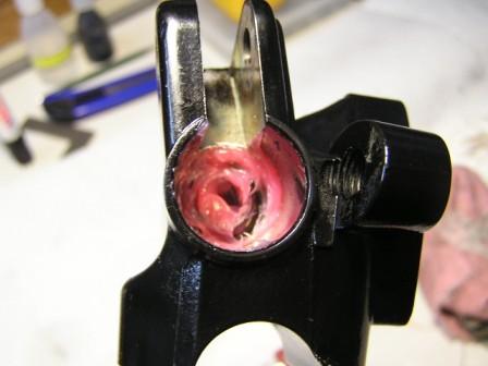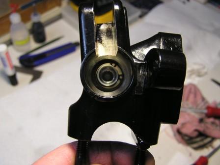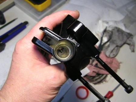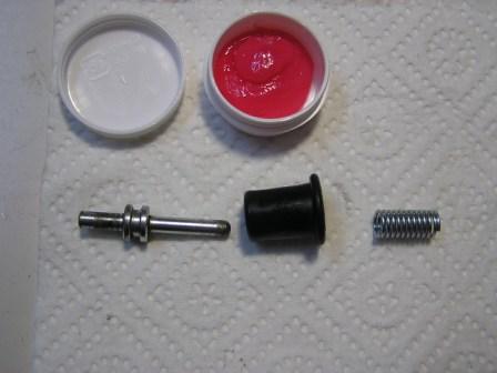 ACHTUNG:  Das ganze dann noch mit etwas Fett versehen (Pic_11), den Stößel, die Staubmanschette und die Feder richtig zusammenbauen, das Bild zeigt die richtige Lage des Stößels (Pic_12), noch mal etwas Fett (Pic_13), die Teile in das Gehäuse einbauen und die Staubmanschette mit einem flachen Holzspatel (kein Schraubenzieher) vorsichtig hineindrücken (Pic_14). Hebel montiert (Pic_15), dabei drauf achten, daß das Stößel - Ende im Loch der kleinen Buchse am Hebel sitzt (a bisserl Fett auch hier), Schraube festziehen, Funktionsprüfung…..Fertig.