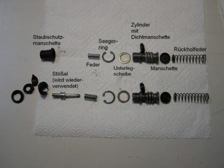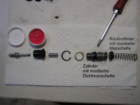 kleinen Wulst hebeln.  Zuerst die Rückholfeder mit dem größeren Durchmesser voran und der Manschette drauf in das Gehäuse einführen (Pic_7). Dann folgt der Zylinder mit der Dichtmanschette drauf. Noch mal in die Bremsflüssigkeit tauchen damit es besser flutscht.