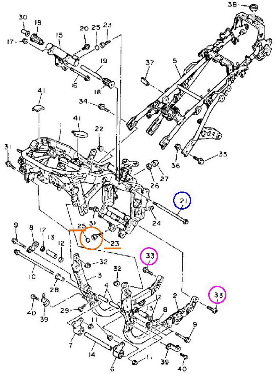 Anmerkung:    Versucht erst gar nicht sie mit einem normalen Schraubendreher zu lösen – Ihr vermurkst sie garantiert. Als Nächstes das Sicherungsblech des Ritzels flach schlagen und anschließend die Mutter (36er Nuß) bei eingelegtem 1. Gang und betätigter Hi.-Radbremse ebenfalls mit dem DLS lösen und Ritzel samt Kette von der Welle ziehen. Die Kette vom Ritzel (vorne) nehmen und Kette einfach hängen lassen. Ritzel bei Seite legen – brauchen wir nicht wieder – es kommt ja ein (neues) Versatzritzel zum Zuge. Dann Hi.-Rad Steckachse + Kettenspanner lösen und Hi.-Rad etwas nach vorne schieben. Das macht später die Montage des Ritzels samt Kette erst möglich. Den Wagenheber unter der Ölwanne positionieren und mit Gefühl so weit nach oben pumpen, bis sich das Vorderrad so gerade eben beginnt zu heben. So sind die Motorhalterungen rel. entlastet und gehen leichter heraus. Jetzt den Seitenständerschalter demontieren (HSS!) und die Unterzüge (Bild 22, Nr. 2+3) abschrauben. Es sind je Seite 4 Schrauben hinten (Bild 22, Nr. 33) und vorne (Bild 22, Nr. 31) die beiden mit Mutter, hinten die beiden sind i.d.R. eingeklebt. Um bei der 3YA an die hinteren Rahmenschrauben heran zu kommen, müssen auch die Fußrastenplatten demontiert werden.