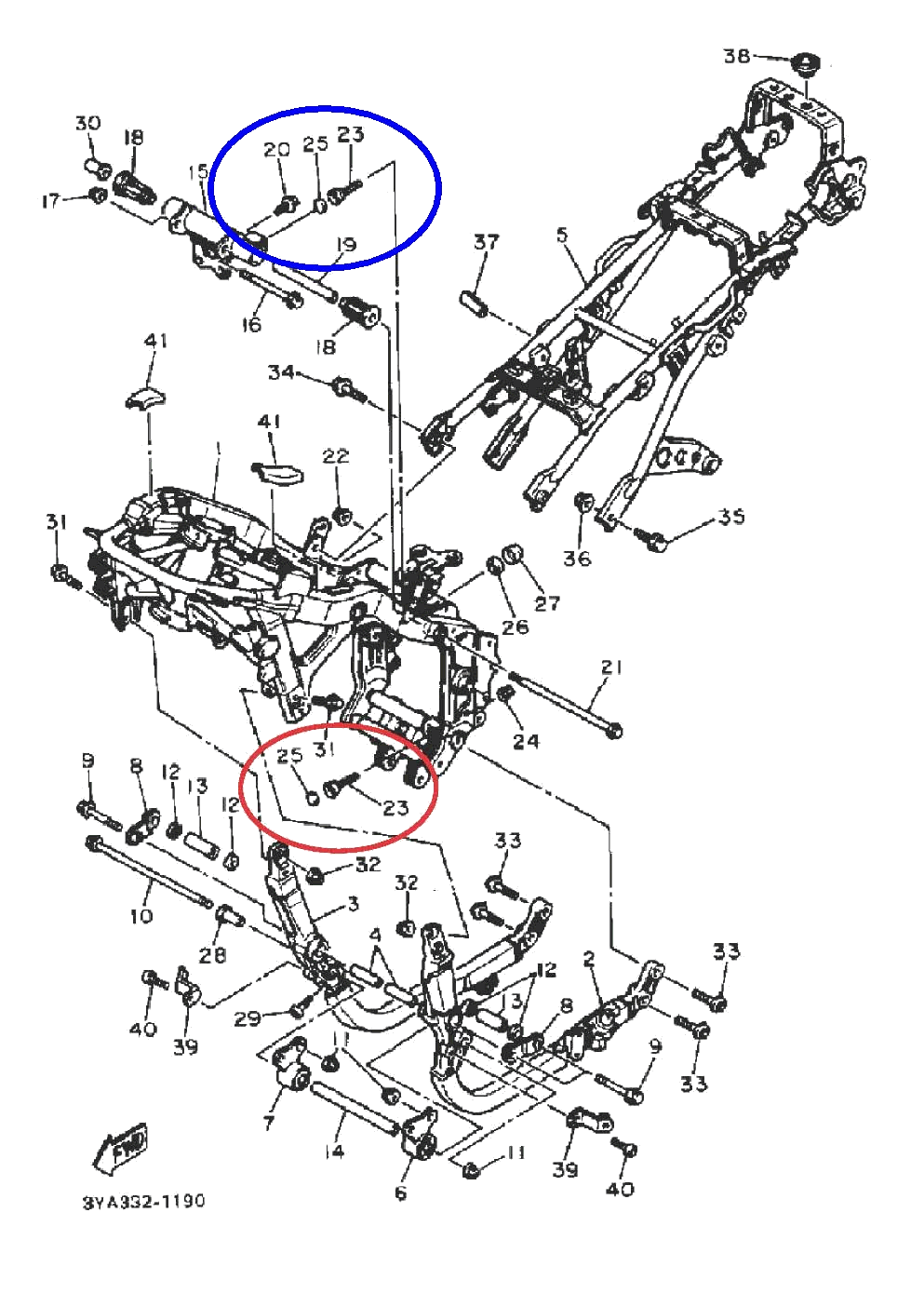 Wo man auch noch hinschauen sollte, ist der Gummidämpfer zwischen Motor und Rahmen-Querrohr unten - siehe roter Kreis . #25 = Gummi (bei Yamaha nicht mehr erhältlich), #23 = Halter / Einsteller dazu Fehlt der oder ist er massiv eingedrückt, dürften die Vibrationen nach der Wartung oben zwar weniger geworden sein, aber sie sind doch noch da, weil eben die Vib´s des Motors hier direkt in den Rahmen gehen (können). Oberhalb dieses Gummipuffers gibt es noch einen im oberen Rahmen-Querrohr - siehe blauer Kreis .