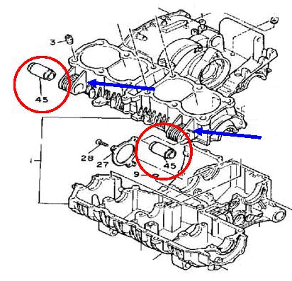 Hier das Microfiche vom 3YA - Motor : mit den roten Kreisen um die betroffenen, fest in den Lagerungen (blaue Pfeile) eingepressten, Messing - Hülsen .