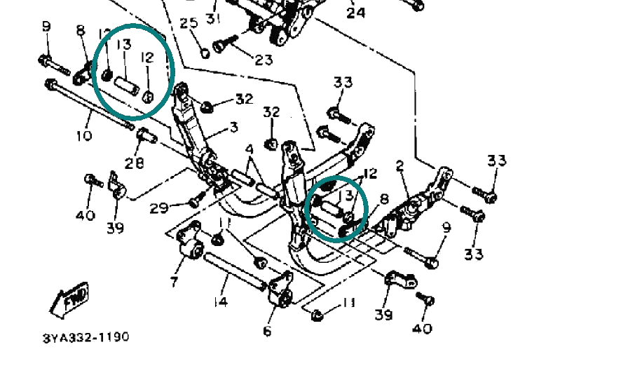 Denn - der Motor der 3YA hängt sozusagen schwingend im Rahmen, will sagen, dem Grunde nach hängt er alleine an dem langen Bolzen (hinten oben) und stützt sich an einem einzigen Gummi-Puffer (Nr. 23&25 im 2. Fiche) links, hinten, unten am Rahmen ab. Die beiden "Laschen" vorne haben nach meiner Einschätzung keine stabilisierende Aufgaben, sondern sollen alleine den Motor gerade im Rahmen halten.