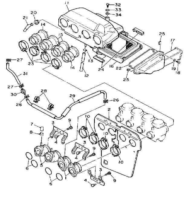 Eine Abmagerung (und Beschädigung des Motors) kann NUR stattfinden , wenn an den Ansaugstutzen (#1 & #5 im Fiche unten) zw. Gaser und Zyl.-Kopf Nebenluft eingesogen wird, weil dann tatsächlich die Mischung aus dem Gaser nochmals mit Luft gemischt wird, was dann tatsächlich zum Abmagern führt und, nach mir unbekannter Zeit, einen Motor- / Zyl.-Schaden (Loch im Kolben z.b.) am betroffenen Zyl. hervorruft.