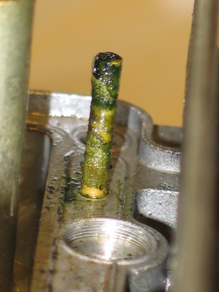 wie es nach ein paar Monaten mit Ethanol-Sprit in der Schwimmerkammer aussehen kann, sprich, wohl vom Ethanol bedingt, mit dieser grünen Kruste überzogen ist. Hatte ich selbst erst vor ein paar Wochen in / an meiner FJ an zwei Düsenstöcken und das nach ca. 5 Monaten Stillstand inne Wärgschdadd