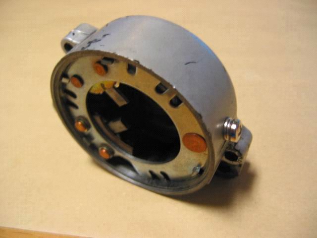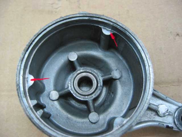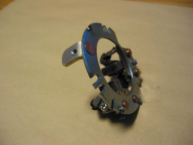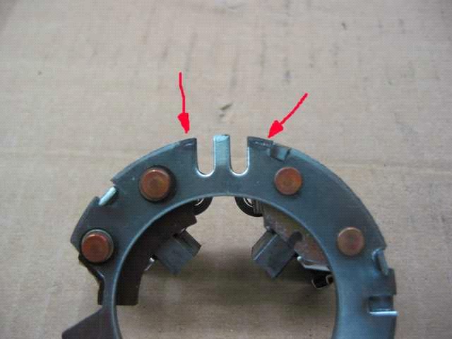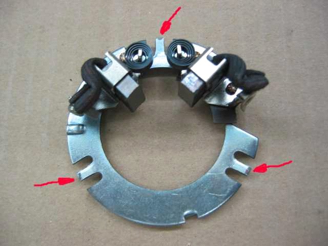 Dieser Deckel drückt an drei Punkten auf die Platte, auf der die Kohlebürsten sitzen. Die Platte, auf der die Kohlen sitzen, hat drei Nasen (siehe rote Pfeile), die etwas hochgebogen sind. Diese Nasen können im Laufe der Zeit etwas nachlassen, so daß der Kontakt zum Deckel nachlässt. Dabei entstehen Funken, die noch mehr Material abtragen. Wenn dann noch die unterschiedlichen Wärmeausdehnungen dazu kommen, ist der Massekontakt nicht mehr ausreichend und der Anlasser will sein Werk nicht mehr verrichten. Diese Kontaktprobleme können zu starken Wärmeentwicklung führen, was zur Schwärzung der Kontakte führt. (siehe rote Pfeile). Siehe die Rückseite der Platte. Die Probleme kannst du jetzt mit dem Nachbiegen der drei Nasen beseitigen.