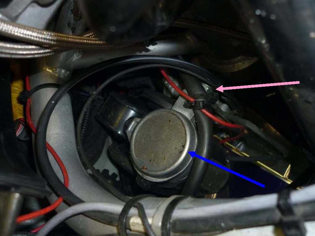Dies ist der Halter der Hupe, der ebenfalls demontiert wird. Dazu die beiden Inbusschrauben heraus drehen und fein aufheben. Der Verteiler hängt nun frei schwebend – macht nichts – es kann nichts passieren.