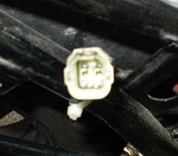In Höhe der Batterie findet man dann einen weißen Stecker mit 4 angeschlossenen Kabeln. (Bild 5 unten) An diesem Stecker finden sich 3 Halte-Punkte , von denen aber nur einer zum Trennen notwendig ist, und zwar derjenige, der mittig zu sehen ist - diesen nach außen ziehen und der Stopfen wird frei zum Herausziehen.