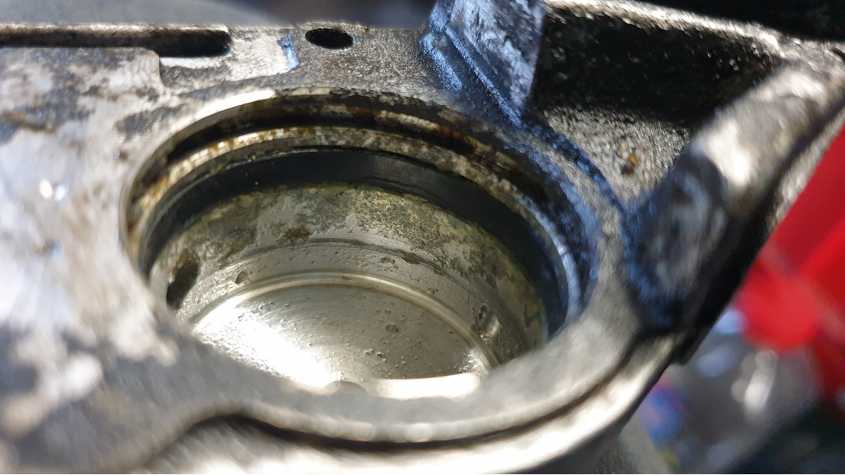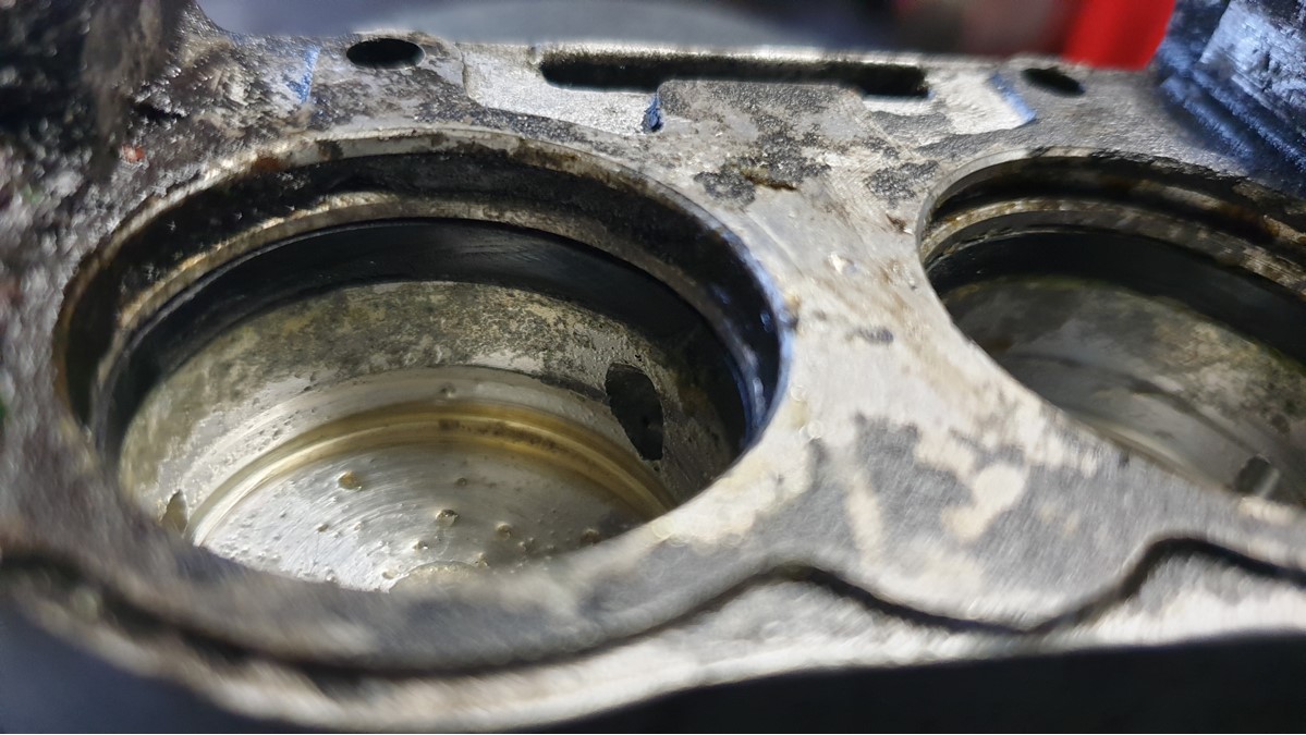 den Dreck / Belag auf den Dichtungen links erkennen, Hinweise: Die dicken Dichtungen haben ( teilweise! ) eine bestimmte Einbaulage und einen trapezförmigen Querschnitt. Ergo ganz genau hinschauen (Lupe z.B.) und "passendes" Ablegen der Dichtungen nach der Entnahme ist erste Pflicht. Die dünnen kann man beliebig einsetzen, sie haben keine besondere Einbaulage. Sie dienen dem Staubschutz der tiefer liegenden Hauptdichtung . Die kleinen Dichtungen der Trennflächen bloß nicht verlieren - sie können wieder verwendet werden und haben keine besondere Einbaulage. Die "Rillen" der Dichtungen setzen sich mit derart viel "Grind" zu, dass es einen gruselt. Der Dreck muß raus und das geht am besten mit einem kleinen, 2 mm breiten, Schraubendreher aus dem Uhrmacherset. Mit der Messing Drahtbürste alle Flächen säubern. Dann mit dem Fett und einer Zahnbürste noch nachwienern und der Sattel ist wieder bereit zur Montage. Beide Dichtungen je Kolben werden Trocken eingesetzt und vor dem Einbau des Kolben GAAAAAAAAANZ dünn mit etwas ATE - Fett eingeschmiert.