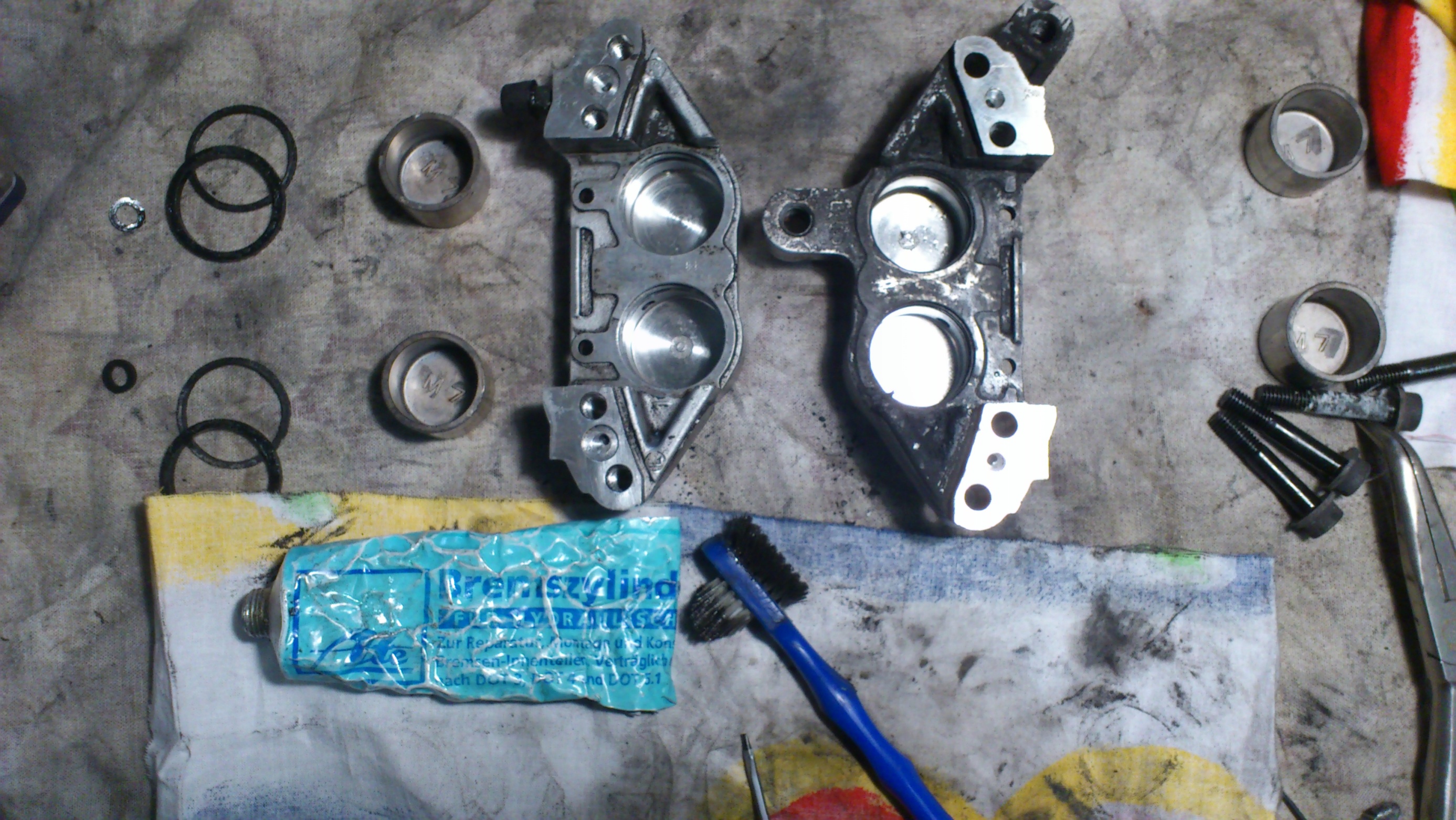 Zusammenbau: Dichtungsnuten reinigen und fettfrei machen Dichtungen trocken einsetzen - jede genau dahin, wo sie vorher war Dichtungen mit ´nem Müh ATE-Paste dünn einfetten, Kolben dito alle Kolben ganz eindrücken kleine Dichtungen in die "Sitze" einlegen (trocken)