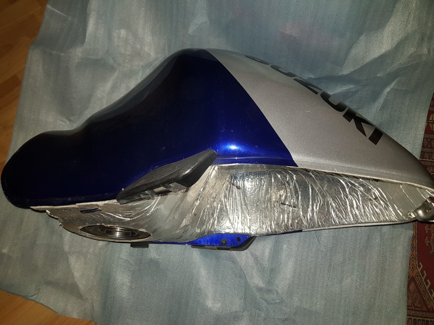Oder aber man verbaut einen Tank der 2002er in blau / silber (identisch zum 2000er Lack) - der hat exakt die gleichen Farben "Pearl Suzuki Deep Blue & Metallic Sonic Silver" , ist so aber kaum bis gar nicht zu finden. Doch mit unendlicher Geduld über gut und gerne 2 Jahre und sehr, sehr viel Glück habe ich diesen gefunden.