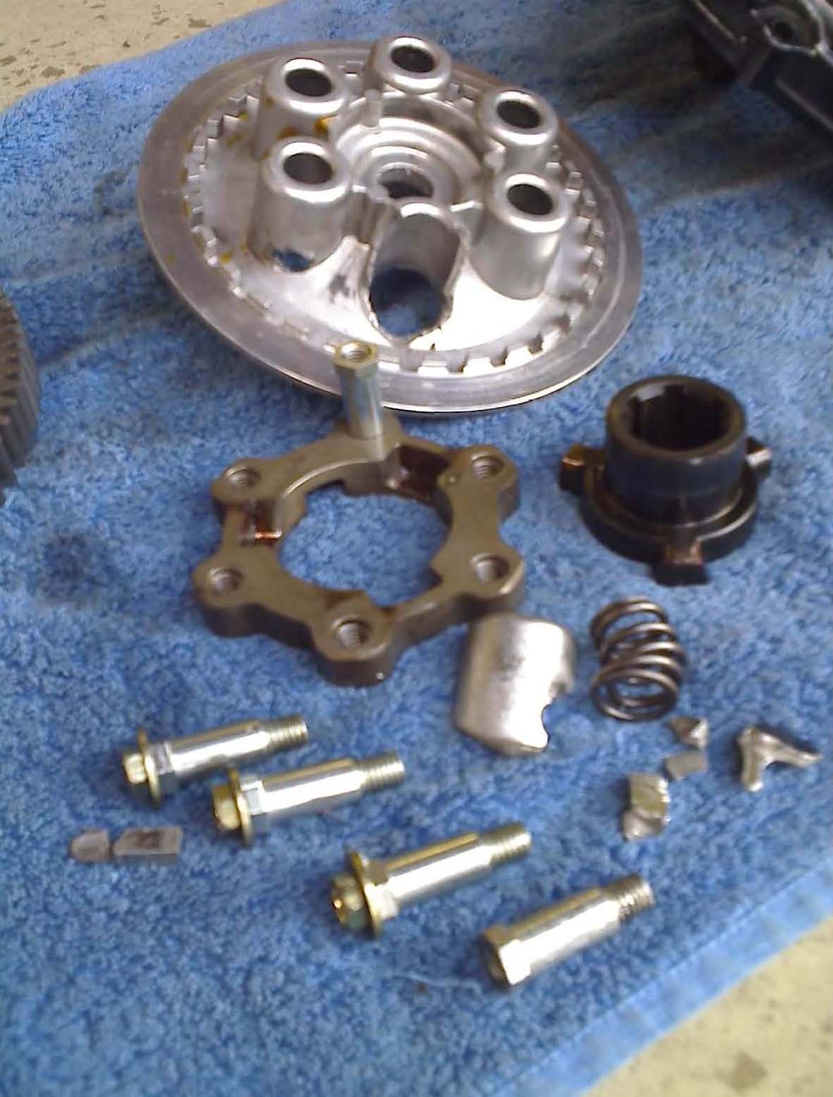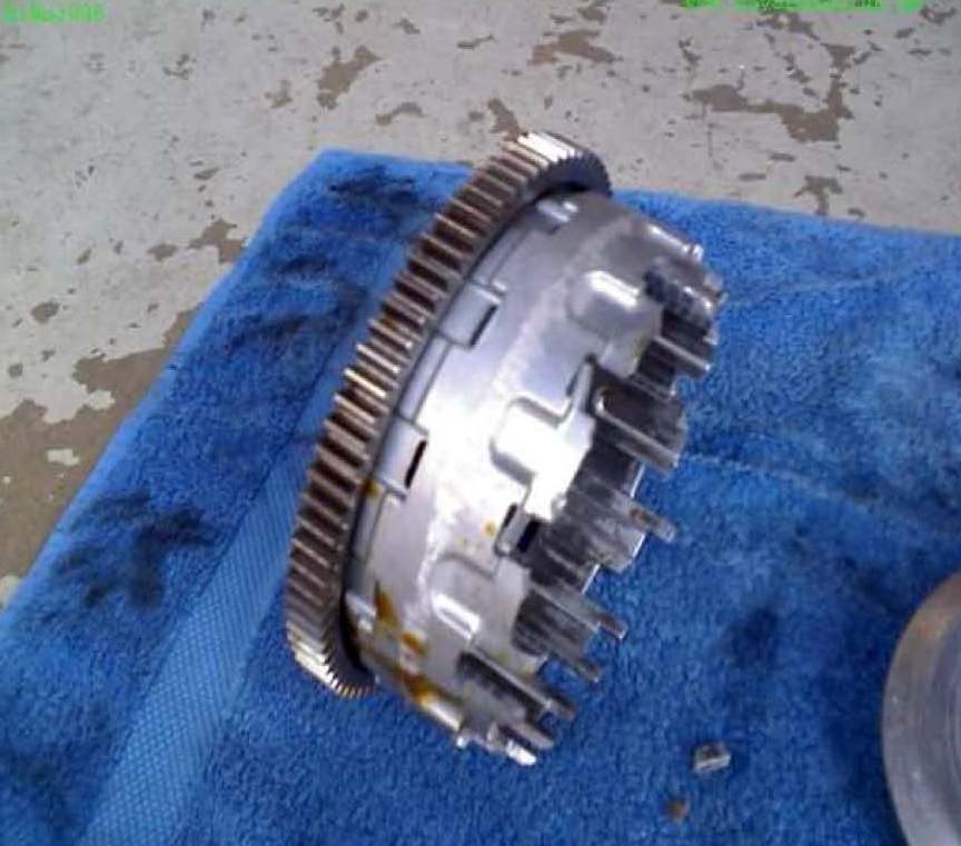 von 6 Bolzen war noch an seinem Platz, Wo verdammt ist der 6te? Ja – der hat sich den Weg nach Draußen gesucht und gleich auch noch den ganzen Kupplungsdeckel zerschossen. In diesem Fall also ein kapitaler Motorschaden End of horror