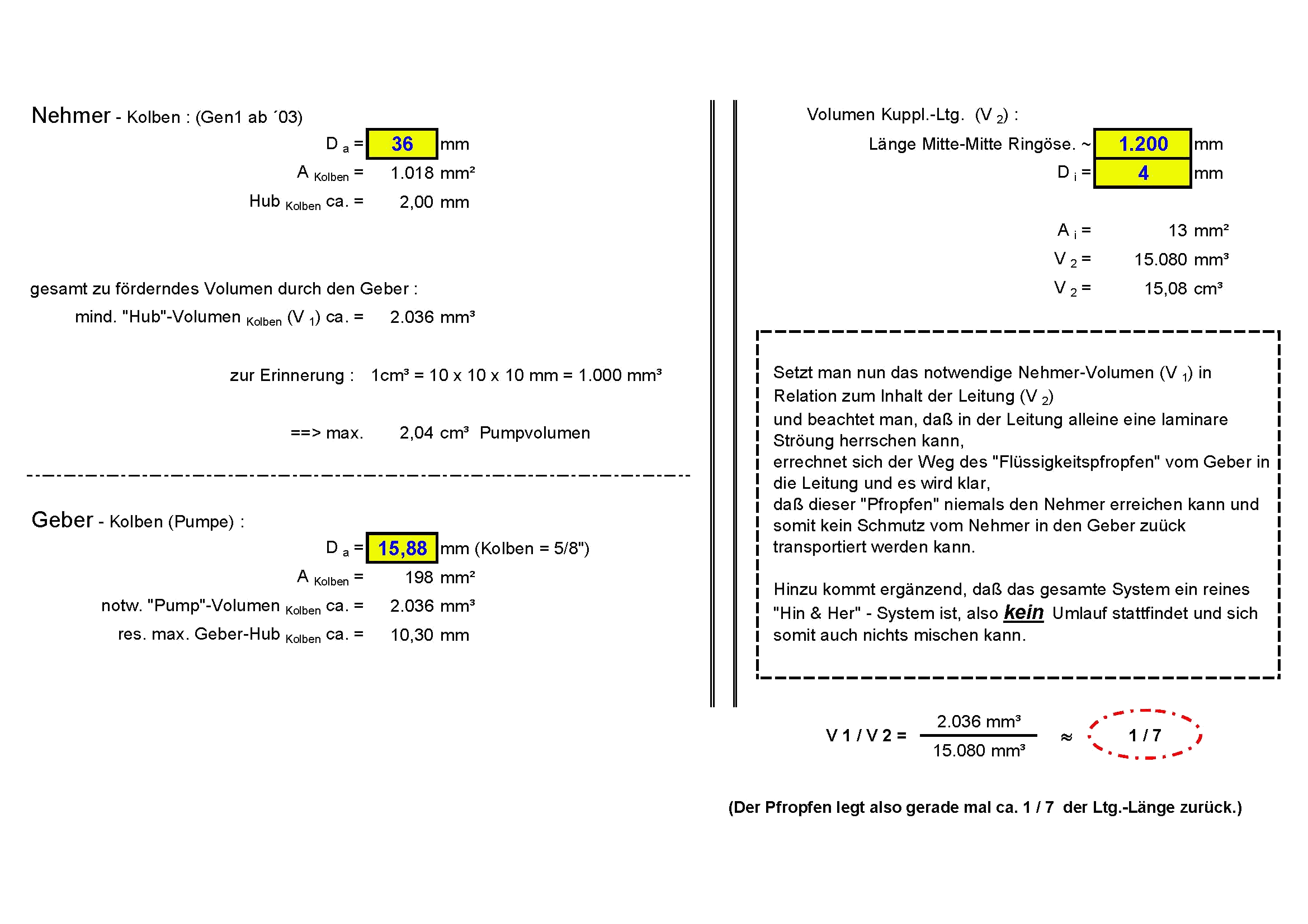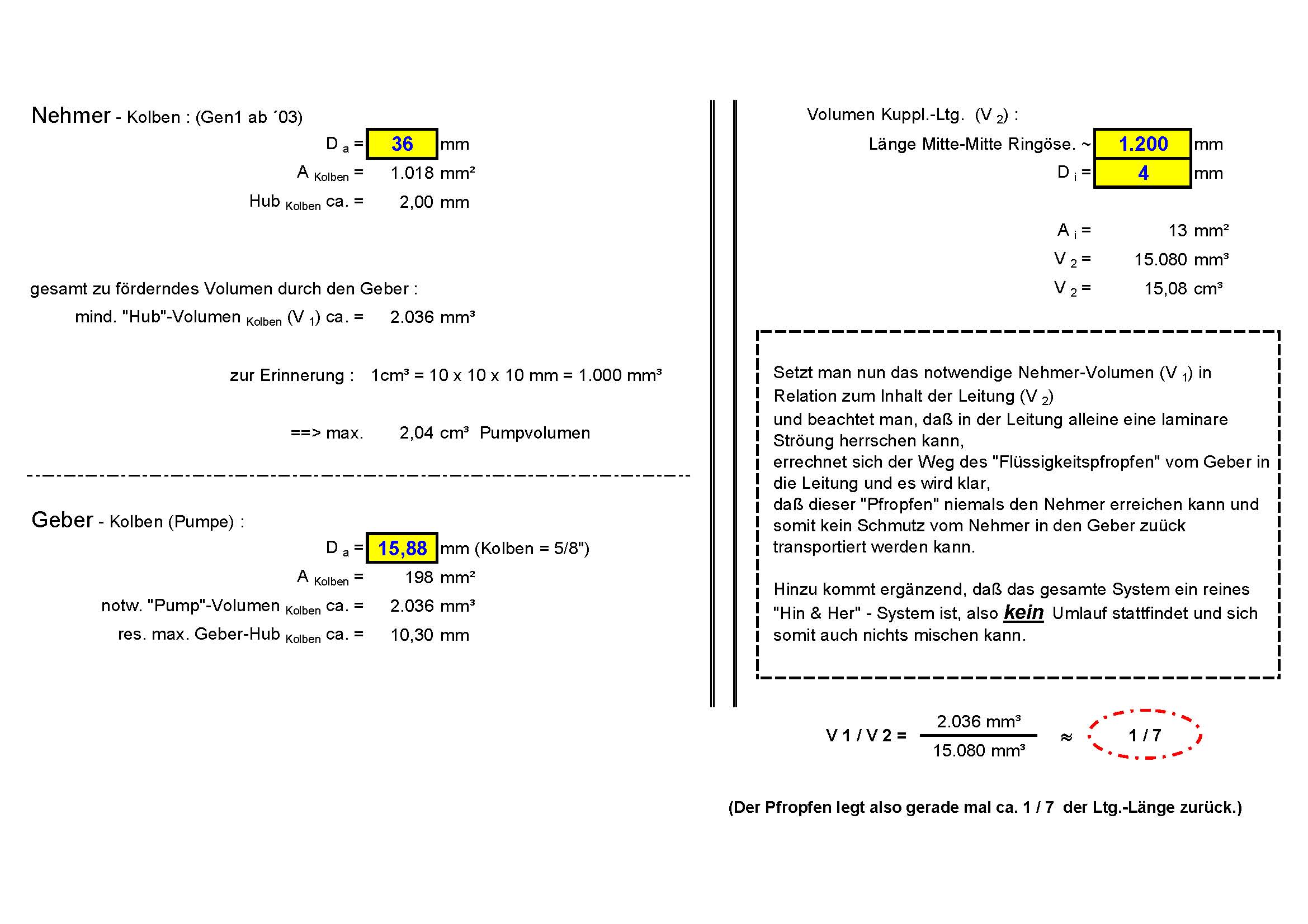 Durchmesser Nehmerkolben A = 36²mm ² x Pi = mm² x dessen max Hub (3 mm) = ... mm³ dagegen die Länge der Ltg. (Di ca. 4 mm) vom Pumpe zum Nehmer und das sich daraus ergebende Volumen = ..... mm³