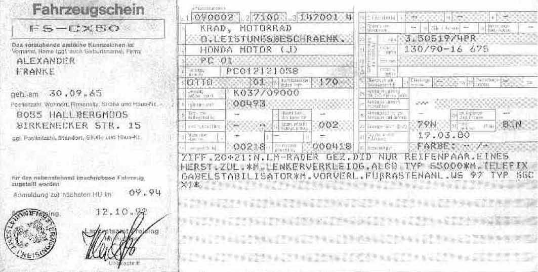 Die HU ist fällig, oder Diese Geschichte ist in keiner Weise übertrieben, gestellt oder erfunden. Sie ist mir am Mittwoch den 22.09.04 so bei der DEKRA Prüfstelle München in der Hufelandstraße passiert. Um es gleich vorne weg zu sagen: Ich habe die Plakette erhalten, wenn gleich sich das mit dem Prüfbericht widerspricht. Wie es zu diesem Bericht kam, möchte ich nun schildern, mit aller wörtlichen Rede, wie sie mir gegenüber geäußert wurde. Es begab sich also, daß ich mal wieder mit´m Mopped zur HU musste. Die Tatsache, daß ich eine DEKRA in der Nähe meiner Arbeitsstätte habe, bringt es mit sich, daß ich seit Jahren hierher fahre. Sei es für die HU oder auch „nur“ für diverse Abnahmen meiner getätigten Umbauten. Einer der Herren sagte mir mal, daß sich der TÜV + DEKRA intern so geeinigt haben: „Wir von der DEKRA machen Eintragungen direkt in den Schein in den neuen Bundesländern und der TÜV in den Alten. Anders herum werden nur Abnahmebescheinigungen ausgestellt, die mitzuführen, aber genauso gültig sind.“ In wie weit das nun stimmt, kann ich nicht sagen… ist mir auch so was von egal. Warum ich das sage: ganz einfach, ich habe derzeit 4 Zettel für meine Umbauten (Stahlflex, Vorgelegte, Konis, großer Tank) von der DEKRA in meinem Koffer + ein Fax von Bridgestone (Technische Bescheinigung zur Vorlage beim Technischen Überwachungsverein) damit ich vorne den BT 45 in der metrischen Größe fahren kann. Die meisten Eintragungen im Schein hat mein Vorgänger machen lassen, von mir kam nur die Vorgelegte, die dann leider von der Seeger in eine Burchard geändert wurde (Rostproblem nach einem ¾ Jahr)….. daher der Zusatzzettel im Koffer. Es gibt noch eine kleine Vorgeschichte, die ich hier erwähnen muß. Ohne die fehlt die rechte Würze dieses Berichts und es würde die „Brisanz“ nicht recht rüber kommen. Ich bin Ende Juli wegen des großen Tanks und dem veränderten Vorderreifen zur Prüfstelle gefahren und der Hr. Schellack (Dipl. Ing.) hat alles für gut befunden. Zum Reifen meinte er ganz lapidar: „Sie haben ja die Freigabe vom Hersteller, das reicht uns und sie brauchen den Zettel nur bei der nächsten HU vorzeigen.“ Das freute mich natürlich, denn so hatte ich mir wieder Kohle gespart.