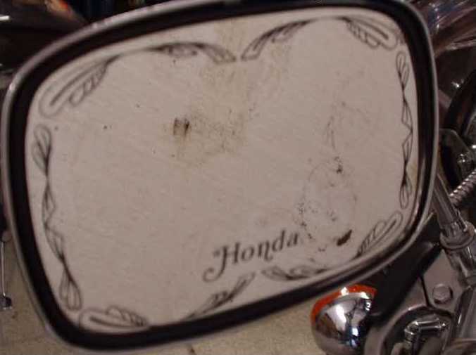Jetzt waren wir beim Lenker und ich hoffte, daß er nicht auch noch den großen Tank ansprechen würde. Denn da wusste ich genau was kommen würde: Der Abstand zwischen Lenker und Tank ist zu gering, da könnte sich dann evtl. eine Biene strangulieren… oder irgend so einen Unfug. Aber weit gefehlt, mein Rückspiegel hatte es ihm angetan, was mit der Bemerkung: „Was ist denn das für ein Gekritzel auf dem Spiegel ?“