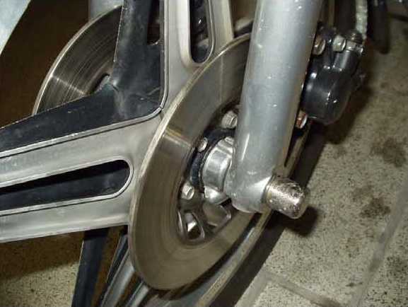 Tja, so ein Dreck, wieder nix zu kritteln, da bleibt nur noch der Kennerblick auf die Bremsscheiben !! Bei einem sooo alten Mopped muß da was zu finden sein, also der „coole“ Spruch: „Haben sie die Bremsscheiben schon mal ausgetauscht ? Die sehen mir schon ziemlich dünn aus.“ „Nein, das sind noch die Ersten und bisher sind sie auch noch nie abgedreht worden.“ entgegnete ich. „Ja, dann schau´n wir mal, meine Schieblehre hab ich jetzt zwar oben im 1. Stock, aber es geht auch so…“ mit diesen Worten holte er einen größeren Schraubenzieher und seinen Profiltiefenmesser raus.