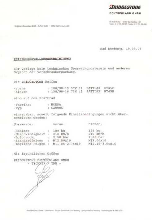 Reifen vorne und hinten, Nachweis der Zulässigkeit fehlt… Das ist doppelt falsch, denn erstens habe ich den Nachweis von Bridgestone (siehe oben) und zweitens ist es nur vorne. Nachweis der Rückenlehne fehlt: das ist egal, denn die muß nicht eingetragen werden. Und jetzt kommt der Hammer, bei einem fehlenden Zulässigkeitsnachweis eines Anbauteils erlischt die Betriebserlaubnis und das ist bestimmt kein geringer Mangel. Jetzt möchte ich mal die Erklärung dieser „Organisation“ hören…. Wie oben gesagt: das alles ist an einem Tag im Zeitraum von 35 Minuten passiert, ich habe nichts hinzu gedichtet oder übertrieben. Genau so ist das am Mittwoch den 22.9.04 von 08:15 – 08:50 passiert.